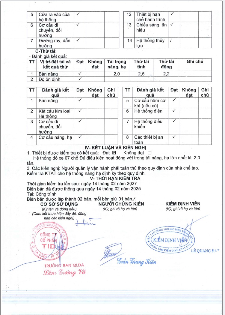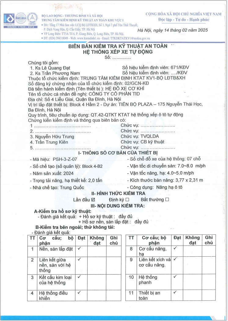 Dưới đây là biên bản kiễm tra kỹ thuật an toàn của dự án bãi đỗ xe thông minh Hanoi Centre, Tiến Bộ Plaza